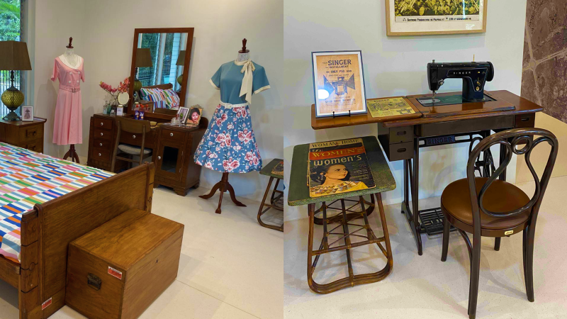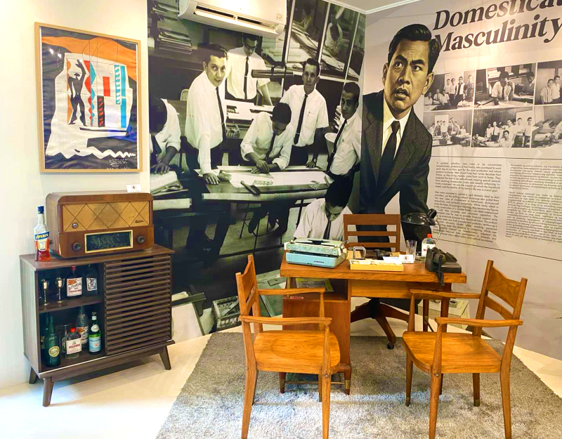 Moving deeper into the home, the first bedroom channels the study of a 1950s Filipino patriarch, complete with a wooden desk, an old radio, a liquor cabinet, and shelves of books and tools. It reflects an era when men were seen as breadwinners and protectors, yet were beginning to take a more active role in family life.