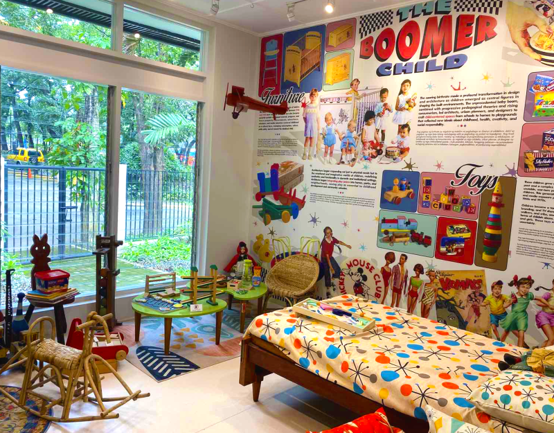 Nearby, a cheerful child’s room brims with toys and bright colors, evoking the Baby Boomer years when play and child-centered design became central to suburban living.